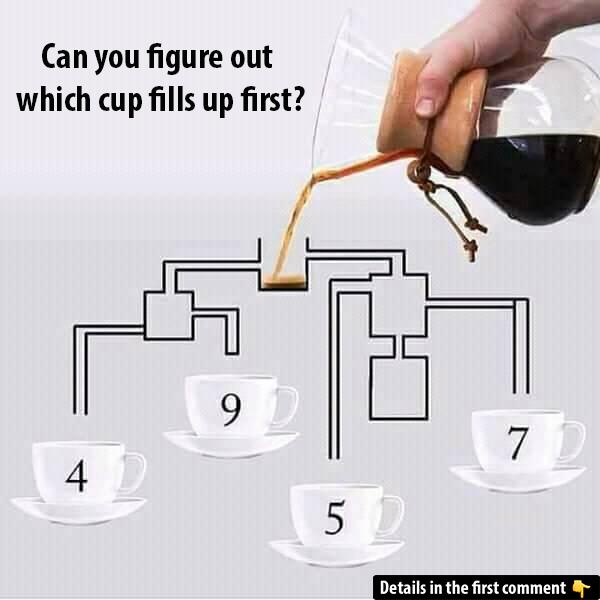 Here’s a fun and challenging riddle for you! Take a look at the image below, where someone is pouring coffee into several cups. However, there’s a twist – you need to figure out which cup will be filled first. Don’t rush, take a moment and observe carefully!