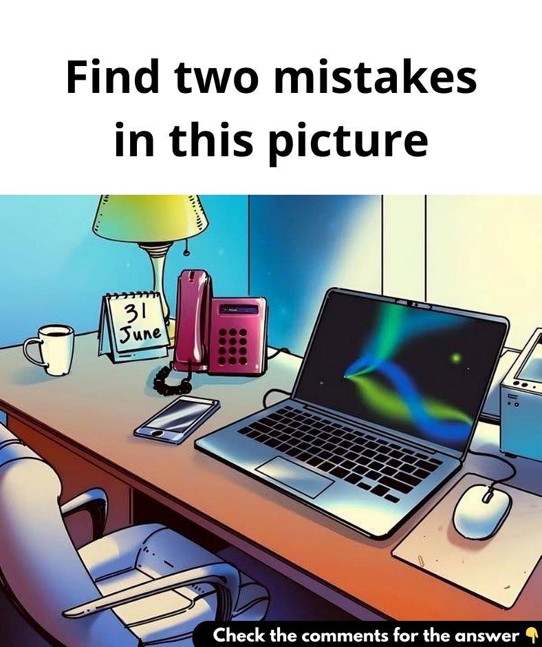 Did you get both mistakes right? The answer to this riddle is simple: “31 June” is incorrect because June only has 30 days, and the laptop lacks a space bar, which is essential for typing.