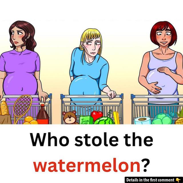 Get ready to test your observation skills with this fun grocery store puzzle! One of these women has stolen a watermelon, but it’s up to you to figure out who. Look carefully at their shopping carts and behavior to spot the thief. Can you solve this challenge and explain your answer? The thief isn’t as obvious as you might think, but with a little attention to detail, you’ll crack the case! Take your best guess and see if you can get it right!